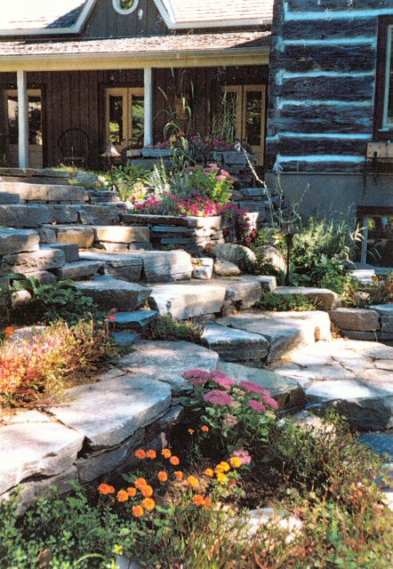 Natural stone landscaping in Parry Sound / Muskoka and the Georgian Bay Area. Quality flagstone hand carved and dry laid. Transform bush into trails down to waters edge with terraced patio's walkways and steps used to turn steep grade cottage lots into fine estates on Lake Muskoka, Joseph, Rosseau, and the Georgian Bay. All work guaranteed. Click photos to view enlarged image |